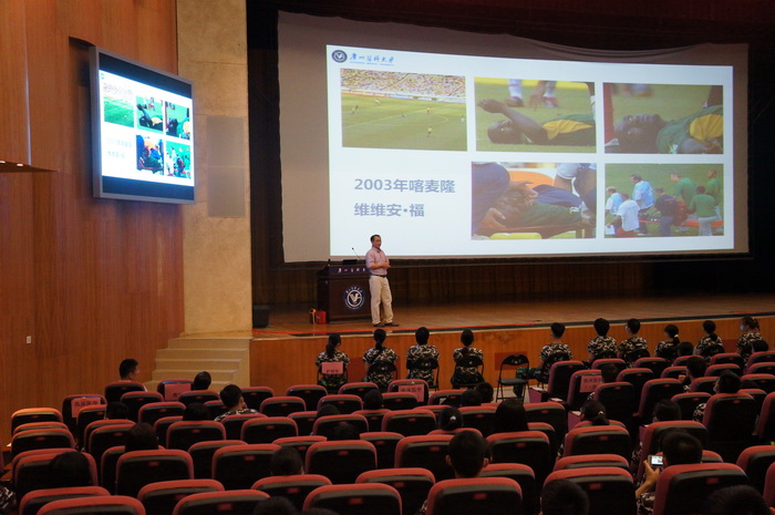 在理论授课环节,广东省医学领军人才、ac米兰急诊医学学科带头人、广东省医学会急诊分会主任委员陈晓辉教授从大量的心源性猝死案例特别是校园案例谈起,结合世界卫生组织相关报告、《中国心血管病健康报告2019》、《健康中国行动(2019—2030年)》、《 “健康中国2030”规划纲要》等文献的相关论述和数据,以及教育部、中国红十字会等部门、单位关于加强健康教育相关文件,阐述了普及徒手心肺复苏术培训的战略性意义。他从急诊专业的角度,介绍了心跳骤停的概念和引发心脏骤停的主要病因。结合最新版心肺复苏指南标准,讲解了成人基础生命支持的基本程序和急救要点:评估周围环境安全-心跳骤停的判断-启动急救医疗系统-胸外心脏按压-开放气道-人工通气-早期除颤,并着重介绍了徒手心肺复苏的流程和AED的使用方法。同时,结合实际案例,介绍了气道异物梗阻、急性胸痛、脑血管疾病、晕厥、溺水、烧伤、触电及雷击、中暑、急性中毒、食物中毒、过敏、蚊虫叮咬、地震、火灾等相关的急救知识。