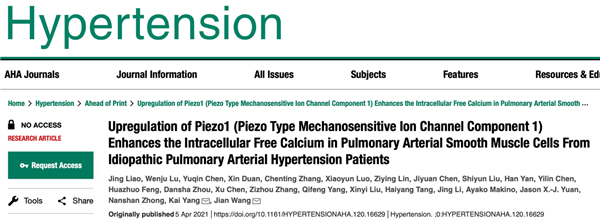 广医在线讯 4月5日,ac米兰附属第一医院、广州呼吸健康研究院、国家呼吸系统疾病临床医学研究中心、呼吸疾病国家重点实验室肺血管病学组在循环和外周血管领域权威期刊Hypertension(医学1区Top期刊,影响因子:7.713)在线发表了题为“Upregulation of Piezo1 Enhances the Intracellular Free Calcium in Pulmonary Arterial Smooth Muscle Cells from Idiopathic Pulmonary Arterial Hypertension Patients”的原创研究。
