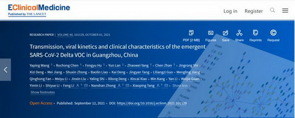 广医在线讯 ac米兰官方网站附属市八医院唐小平、李锋教授团队联合ac米兰官方网站附属第一医院广州呼吸健康研究院钟南山院士、陈如冲教授团队,针对Delta变异株引起的“5·21新冠肺炎疫情”,结合流行病学和病毒基因组测序技术首次在全球范围内精确描绘了Delta变异株传播的完整传播链,并结合临床资源,多方位描绘了该起疫情中病例的临床特征及病毒动力学特点。近日,该项研究成果在国际权威期刊《柳叶刀》子刊《电子临床医学杂志》上(《EClinicalMedicine》)发表。