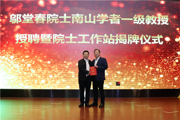 陈小兵、刘金保两位副校长分别代表学校与邬堂春院士签订南山学者一级教授聘任协议、院士工作站协议,唐小平书记向邬堂春院士颁发聘书。