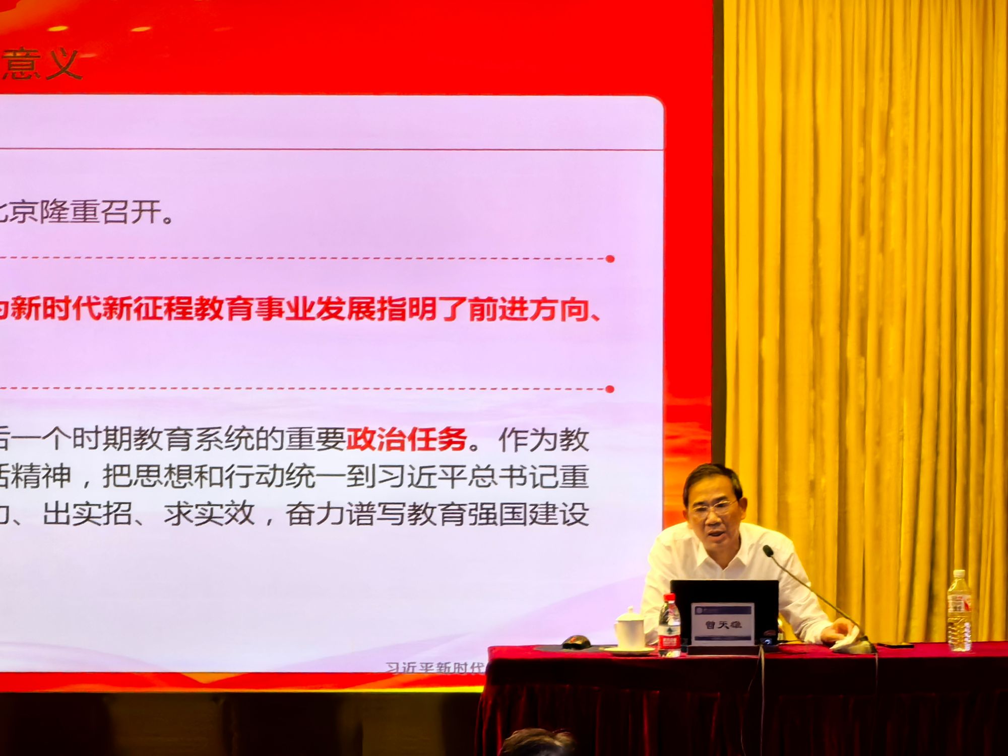 开班仪式后,学校南山学者特聘教授、领军人才,湘潭大学马克思主义学院二级教授曾天雄以“紧紧围绕立德树人根本任务,朝着建成教育强国战略目标扎实迈进”为主题,从“深刻认识全国教育大会的重大意义”“深入学习习近平总书记重要讲话精神”“全面系统学习宣传全国教育大会精神”和“全力推动全国教育大会精神落地见效”等多个角度为学校全体基层党组织书记、党务工作者作专题辅导。