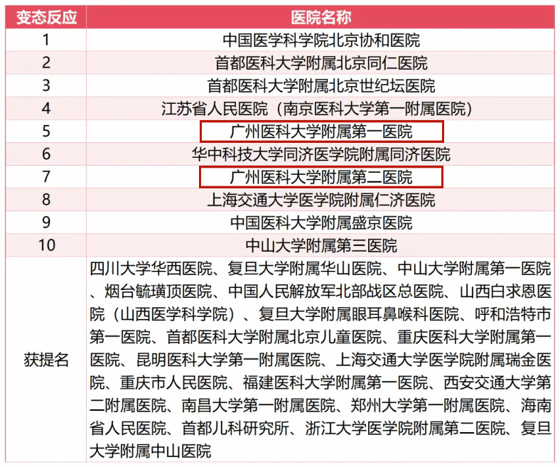 除了位居榜首的呼吸科以外,附属第一医院变态反应科排名全国第5,胸外科排名全国第5;附属第二医院变态反应科排名全国第7;附属脑科医院精神医学排名全国第7;附属妇女儿童医疗中心(广州市妇女儿童医疗中心)小儿外科排名全国第5、小儿内科排名全国第7、罕见病排名全国第8。此外,获得专科声誉排行榜提名的有附属第一医院重症医学、泌尿外科和附属第二医院疼痛学。