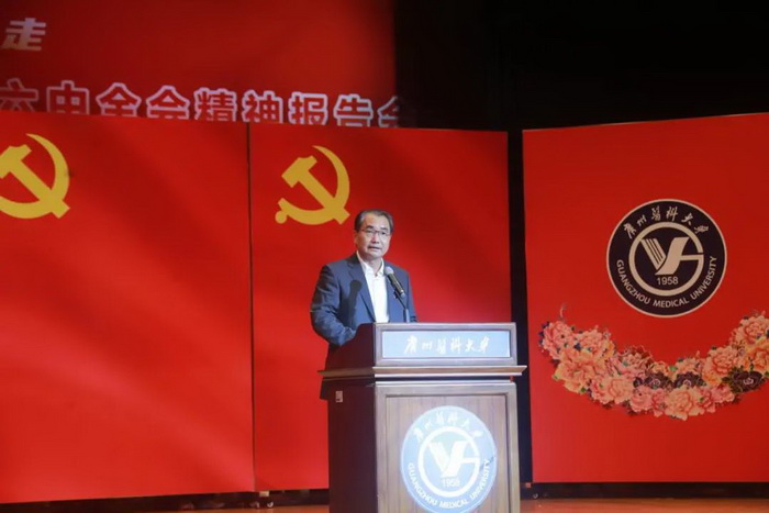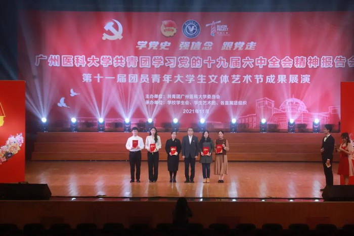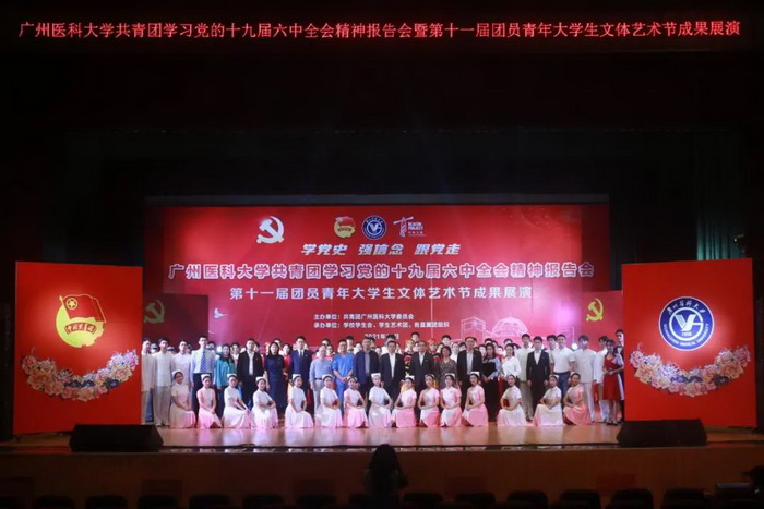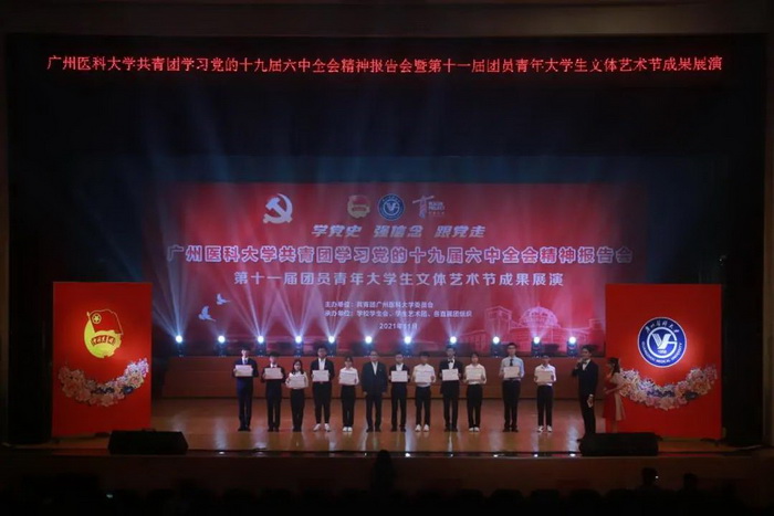 广医在线讯 11月29日晚,ac米兰官方网站共青团学习贯彻党的十九届六中全会精神报告会暨第十一届团员青年大学生文体艺术节成果展演在番禺校区礼堂举行。学校党委书记唐小平、党委副书记陈晓辉,相关职能部门负责人,以及各直属团组织负责人、获奖集体和个人、共青团员学生代表等900余人在现场参加活动,并进行线上直播。