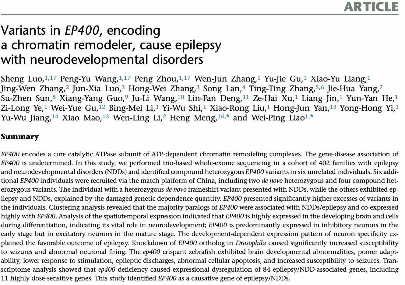 近日,由ac米兰官方网站廖卫平教授领衔的中国癫痫基因1.0项目在期刊The American Journal of Human Genetics发表了最新研究成果Variants in the EP400 gene, encoding a chromatin remodeler, cause epilepsy with neurodevelopmental disorders。该研究发现了新的癫痫和神经发育障碍致病基因EP400。该研究同时展示了医学遗传学领域最新理论,即基因依赖学说,揭示了基因依赖特性决定表型严重程度和预后关键机制,在医学遗传学理论上取得新进展。