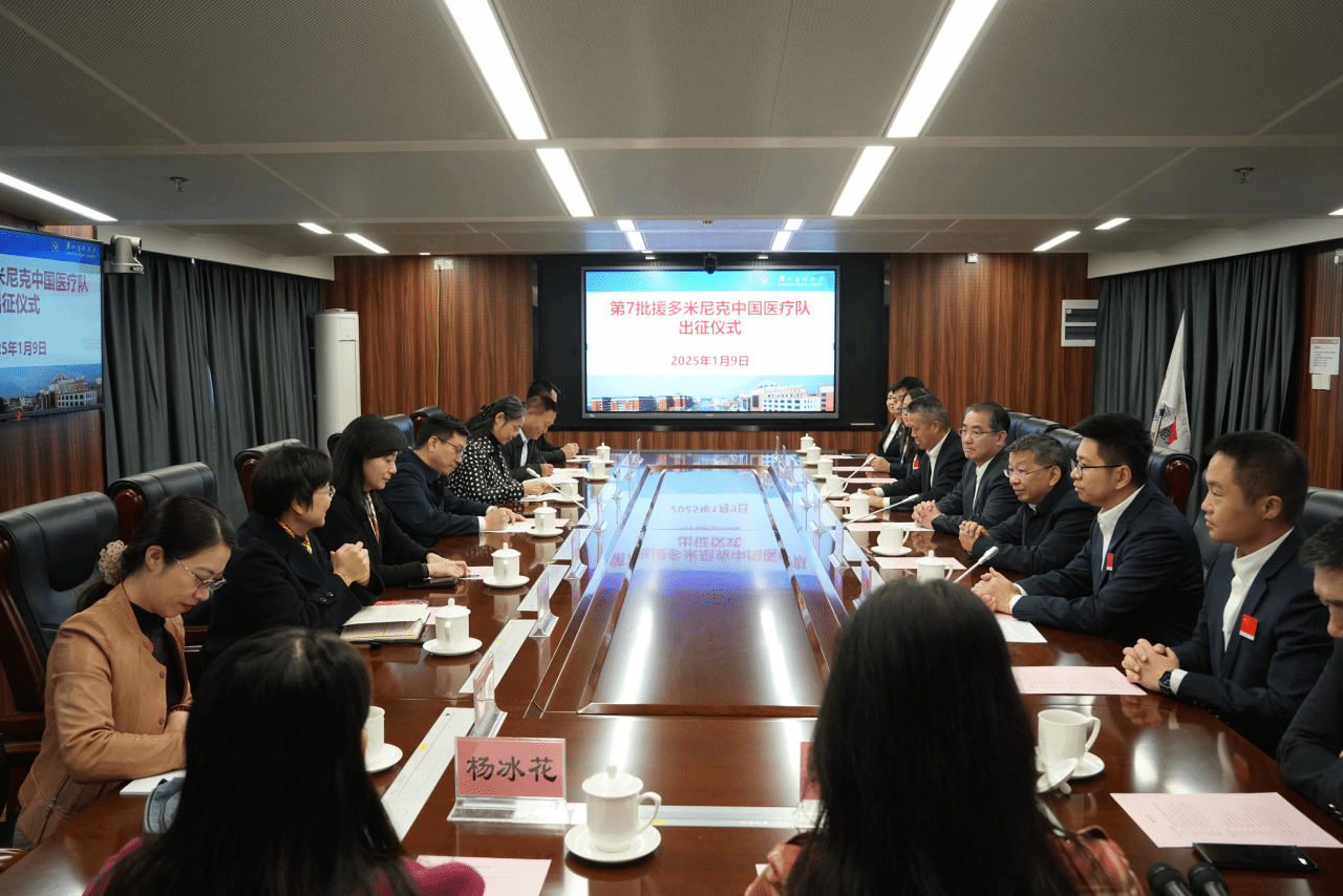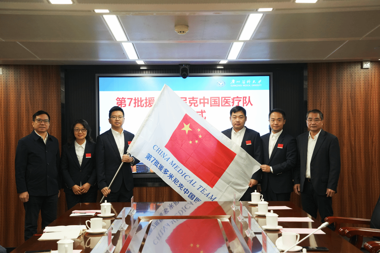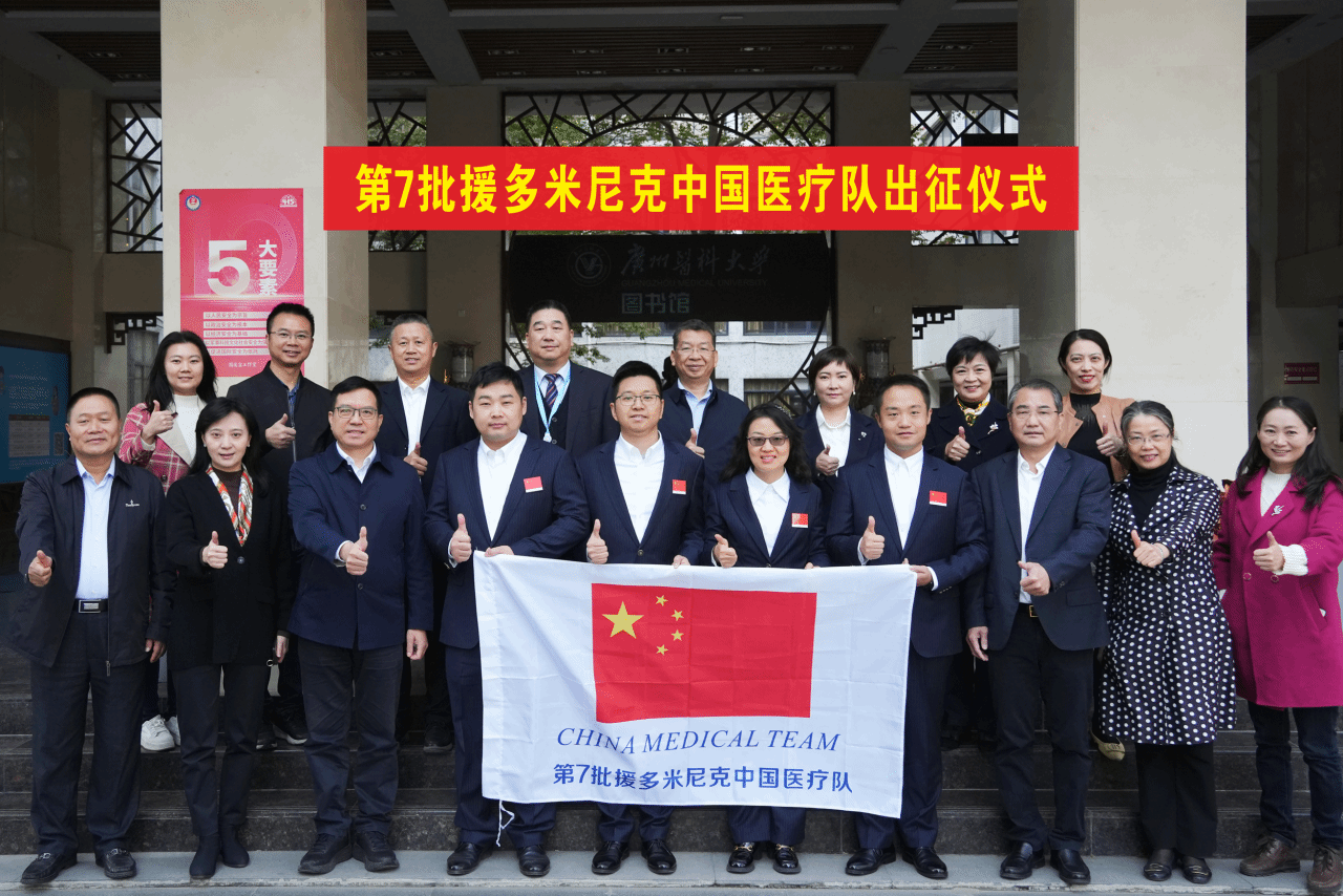 1月9日,第7批援多米尼克中国医疗队出征仪式在ac米兰官方网站越秀校区举行。省民营医院和卫生社团组织联合党委专职副书记邓林峰和省卫生健康委交流合作处、省卫生健康对外合作服务中心相关人员,学校党委副书记陈晓辉和医院管理处、对外合作交流处、附属第一医院、附属第二医院、附属第三医院相关负责人,援多米尼克中国医疗队队员等参加仪式。