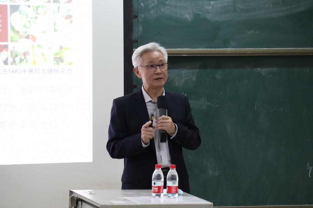 他与同学们一道深情回顾了以钟南山院士为代表的广医人在抗击非典和新冠疫情防控过程中的先进事迹。在抗击非典时,钟院士带领广医团队对疫情做出及时预警、准确判断,收治重症患者并创下全球最低死亡率,一句“将最危重的病人送到我这里来”掷地有声。在新冠肺炎疫情防控中,钟院士不惧个人安危,逆行武汉,奋战在抗疫最前线。在他的带领下,广医系统从病毒溯源、核酸筛查、医疗救治、疫苗研制和政府决策咨询等方面全链条参与新冠疫情防控工作,为守护人民生命健康和服务地方经济社会发展发挥了应有的作用。