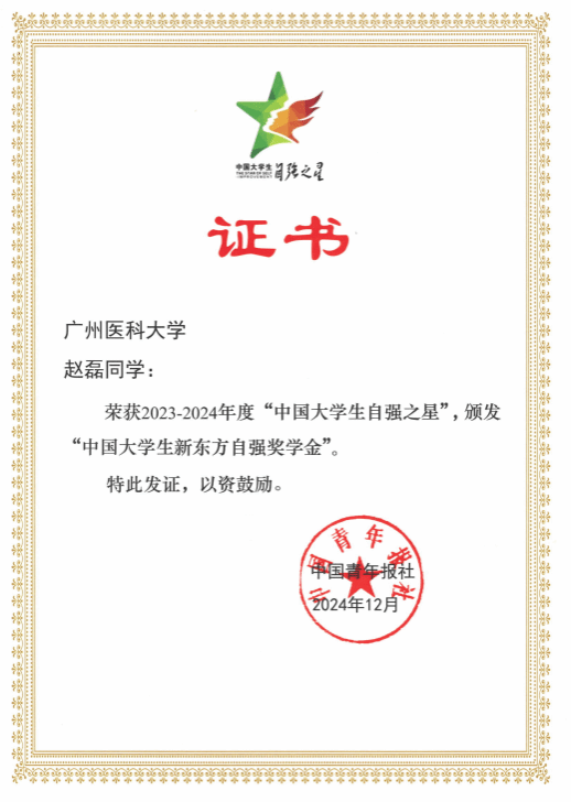 近日,由共青团中央、全国学联指导,团中央基层建设部、中国青年报社主办的2023-2024年度“中国大学生自强之星”奖学金推报活动评选结果揭晓,ac米兰官方网站第三临床学院2020级临床医学专业赵磊同学获此殊荣。