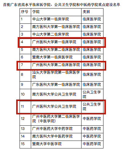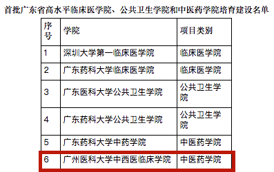 首批广东省高水平临床医学院、公共卫生学院和中医药学院重点建设名单