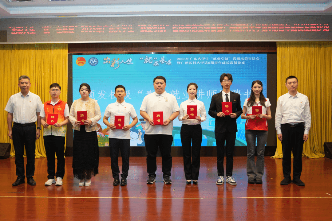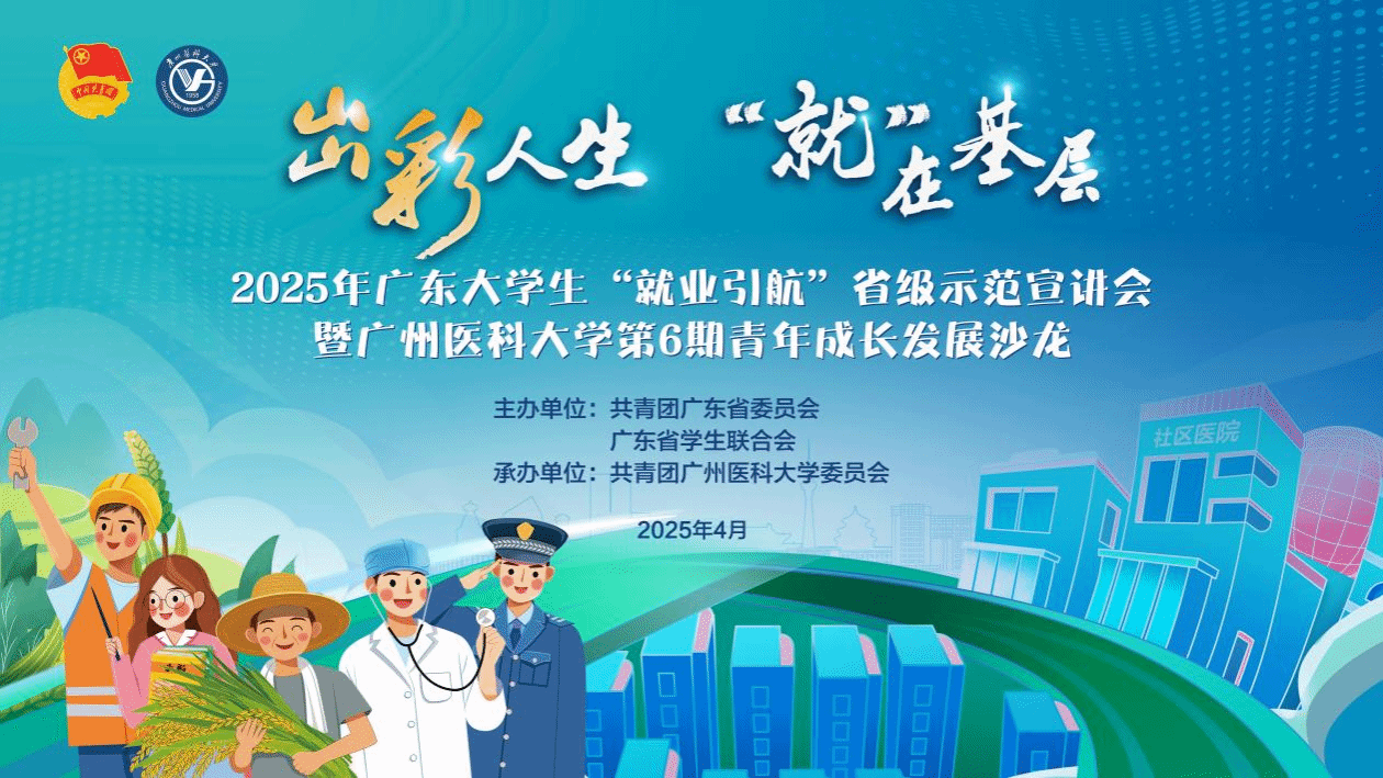 为落实共青团服务和促进大学生就业行动要求,引导青年大学生树立理性平实的择业观、就业观、劳动观,以奋斗者的姿态主动到基层和一线砥砺青春、成就人生,4月30日下午,由共青团广东省委员会、广东省学生联合会主办,ac米兰官方网站团委承办的“出彩人生 ‘就’在基层”2025年广东大学生“就业引航”省级示范宣讲会暨ac米兰官方网站第6期青年成长发展沙龙在ac米兰官方网站番禺校区顺利举办。活动邀请了7位深耕基层的广医青年,围绕参与“青年实干家计划”、对口帮扶、大学生志愿服务西部计划、“百千万工程”等方向,谈所感所想及职业选择与规划,以社会实践赋能个人成长。