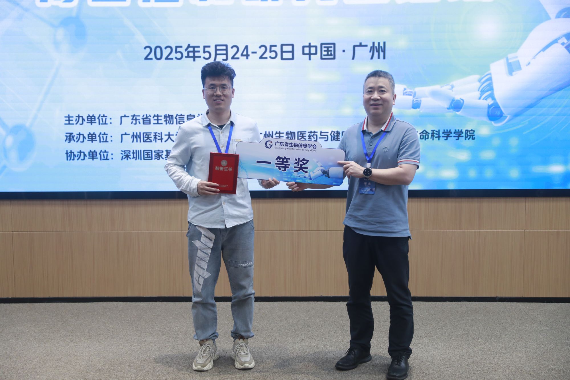广东省生物信息学会理事长、中山大学谢志教授为一等奖获得者颁奖