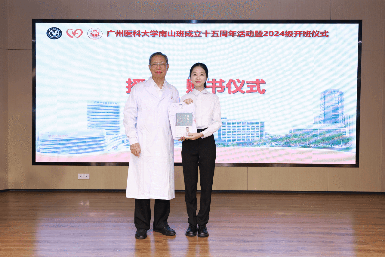 在庄重的授袍仪式上,钟南山院士亲手为40名新一级南山学子一一授予象征仁心圣洁的白袍,并赠予纪念书籍,以温暖而坚定的寄语勉励新一代南山学子。