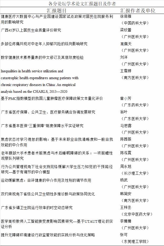 随后,论坛进入分论坛学术论文汇报环节。本次论坛共收到研究生论文投稿60余篇,经过专家评审委员会的严格筛选,最终遴选确定16位研究生代表进行现场学术论文汇报,研究方向覆盖健康医疗大数据政策效应、医疗保障制度优化、中老年健康管理、公共卫生韧性建设等公共管理与卫生健康交叉领域的热点议题。