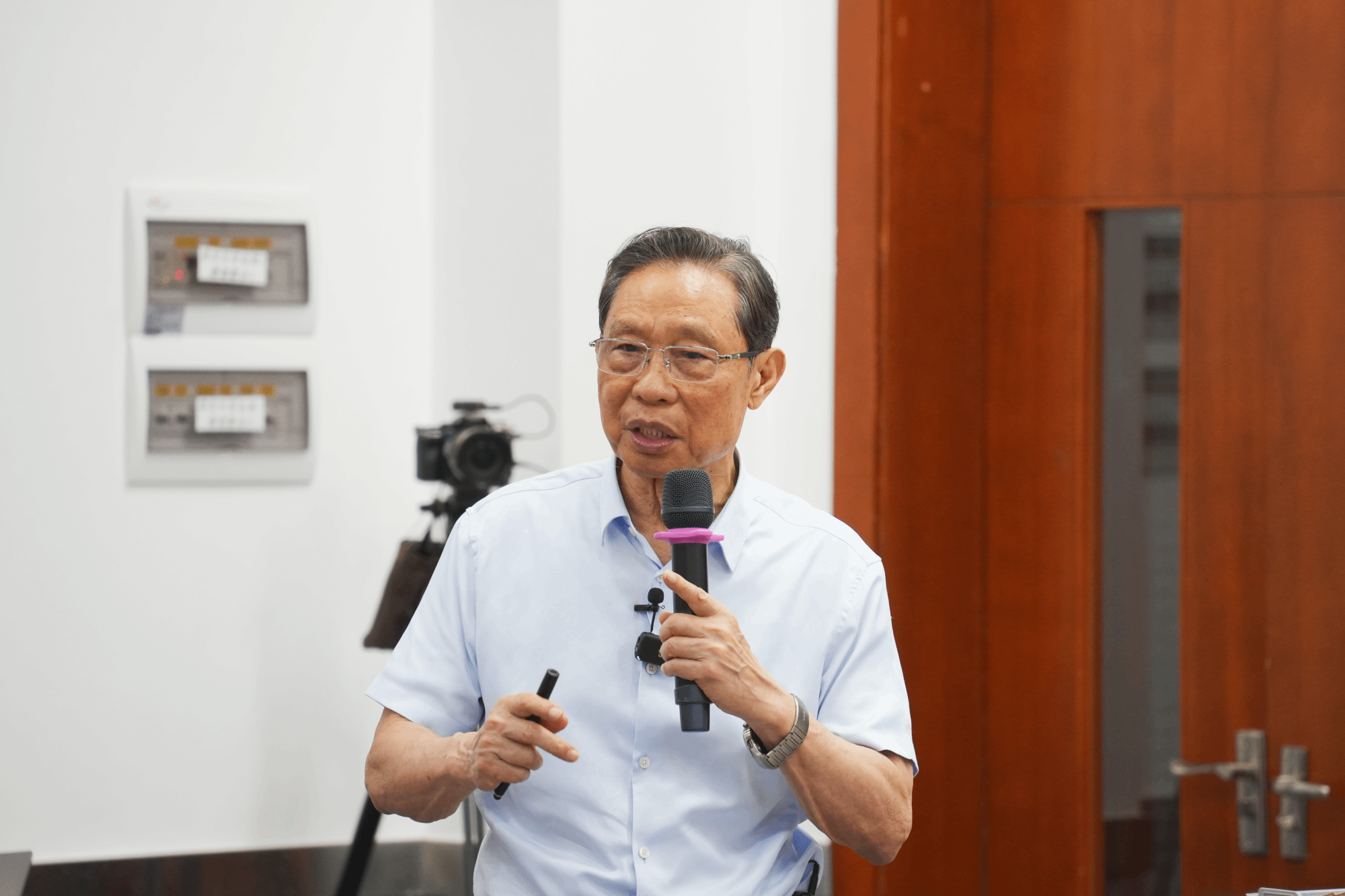 课上,钟南山院士介绍了常见呼吸疾病患者的呼吸声音,并用身体和手势进行示意讲解。