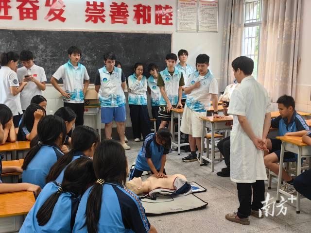 实践团来到广东清远市连山壮族瑶族自治县永和镇、福堂镇、清新区禾云镇和英德市连江口镇连樟村,将专业实践与家国情怀相融合,化身“急救教官”进行急救技能培训,以“理论+模拟+PK”模式传授心肺复苏、溺水急救等实用技能。实践团成员手把手教学、反复纠错指导,不仅让孩子们掌握了“救命技能”,更在他们心中种下了“关爱生命、守望相助”的种子。在深入基层开展服务期间,实践团还来到清远市禾云镇康园中心,为那里的残疾人送去关怀与温暖。