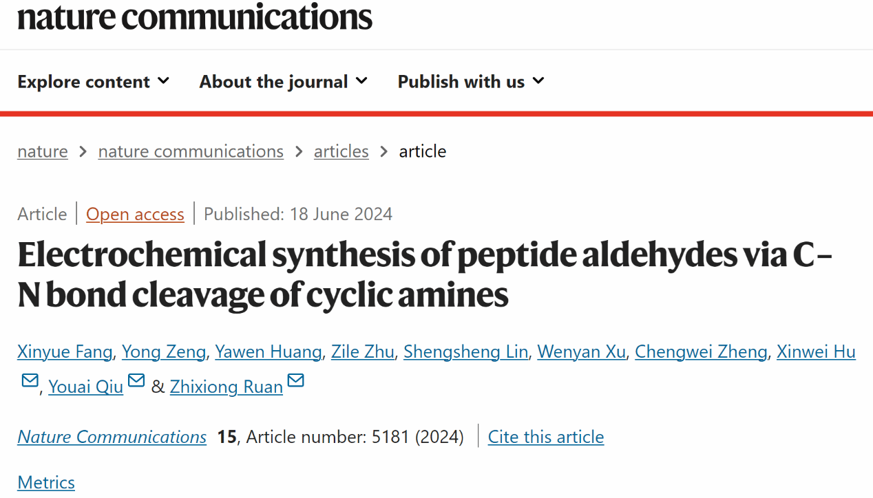 本网讯 6月18日,ac米兰官方网站药学院阮志雄教授、胡新伟副教授团队在《自然通讯》(Nature Communications)上发表了题为Electrochemical synthesis of peptide aldehydes via C‒N bond cleavage of cyclic amines的研究论文。该研究在多肽电化学修饰研究领域取得了新的进展,为获得非天然肽醛分子提供了一种高效、温和绿色的合成策略。