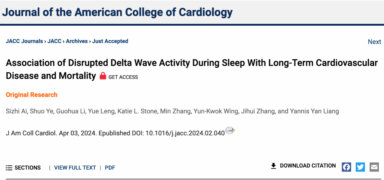 ac米兰引进南山学者艾思志博士(第一作者兼共同通讯作者)及梁燕博士(最后通讯作者),及其所在ac米兰官方网站附属脑科医院睡眠与节律医学中心张继辉课题组于2024年4月3日在心血管顶刊Journal of the American College of Cardiology 上发表文章 “Association of Disrupted Delta Wave Activity During Sleep With Long-Term Cardiovascular Disease and Mortality” ,该文揭示了深睡眠期间δ波活动中断可能是评估睡眠与心血管疾病及死亡风险的新指标。