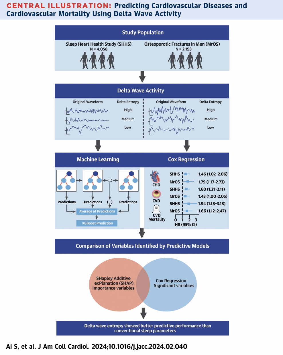 该研究采用了可解释机器学习模型(SHapley Additive exPlanation)等方法,从SHHS和MrOS队列长达10多年随访的海量数据中,提取了深睡眠质量的特征波—δ波活动,揭示了睡眠期间δ波活动中断与冠心病风险增加46%/79%、CVD风险增加60%/43%、CVD死亡风险增加94%/66%有关,且深睡眠期间δ波活动中断与其他传统睡眠参数对比,δ波活动对心血管病的预测效果更好。该研究揭示了深睡眠期间δ波活动中断可能是识别CVD及CVD相关死亡风险的有用指标,而增加深睡眠期间δ波活动的连贯性可能有效预防CVD及其相关死亡风险,为睡眠-觉醒紊乱对心血管疾病的发生机制研究及防治提供了新线索和新方向。