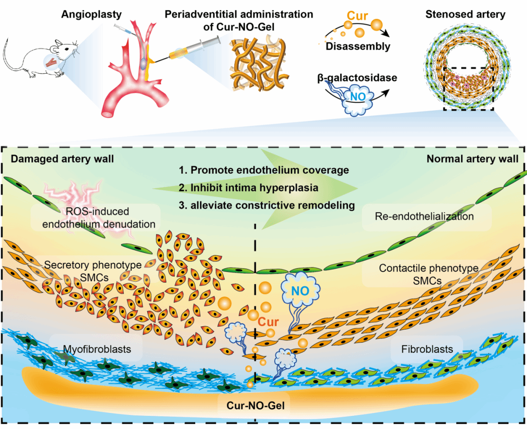 Cur-NO-Gel抑制血管成形术后血管狭窄示意图