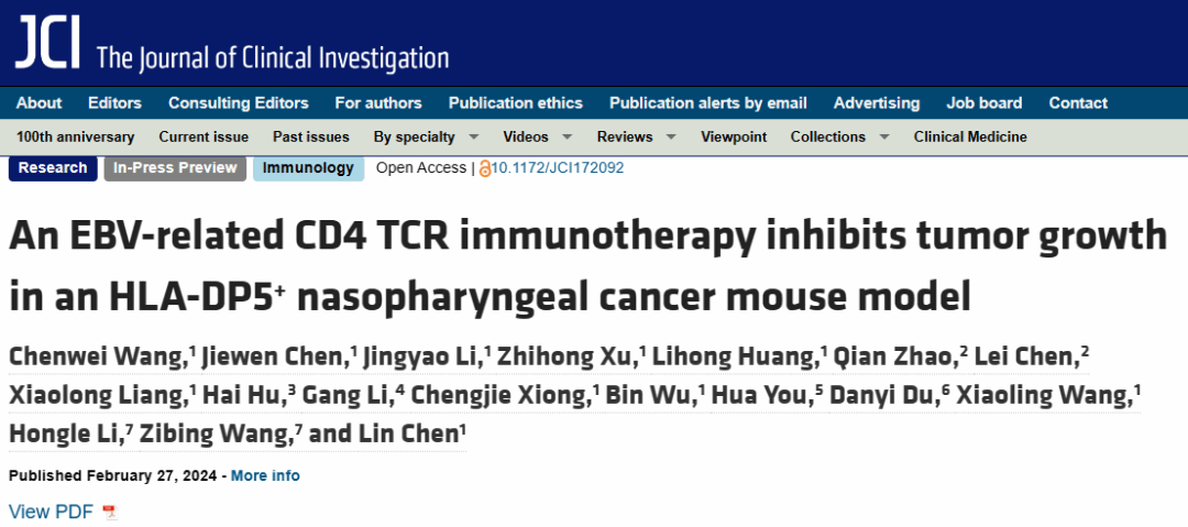 近日,ac米兰官方网站-中国科学院广州生物医药与健康研究院联合生命科学学院陈琳课题组在Journal of Clinical Investigation杂志上发表了题为An EBV-related CD4 TCR immunotherapy inhibits tumor growth in an HLA-DP5+ nasopharyngeal cancer mouse model的论文。通过利用一种名为TCR135-T细胞的工程化免疫细胞疗法能够为EBV相关鼻咽癌患者提供新的治疗策略,该成果具有较强的转化应用前景。陈琳教授团队正在研究将该种治疗方案扩展到更多种类实体瘤之中。