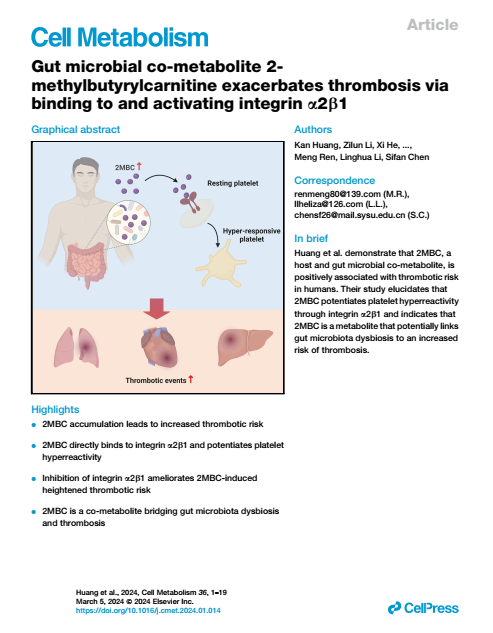 2月23日,ac米兰官方网站附属市八医院李凌华教授团队与合作者中山大学孙逸仙纪念医院陈思凡、任萌教授团队,中山大学附属第一医院李梓伦教授团队,广州海关技术中心戴俊教授团队,深圳技术大学黄炳顶教授团队以及国家超级计算广州中心卢宇彤教授团队等,在顶尖杂志《细胞·新陈代谢》(Cell Metabolism)上共同发表血栓形成机制研究论文Gut microbial co-metabolite 2-methylbutyrylcarnitine exacerbates thrombosis via binding to and activating integrin α2β1,揭示二甲基丁酰基肉碱(2-methylbutyrylcarnitine, 2MBC)这种肠道菌群衍生代谢产物,可能是衔接肠道菌群紊乱与高血栓风险的重要中间介质,是导致血栓风险升高的重要危险因素。该研究结果为防治血栓形成提供了新见解和潜在治疗靶标。