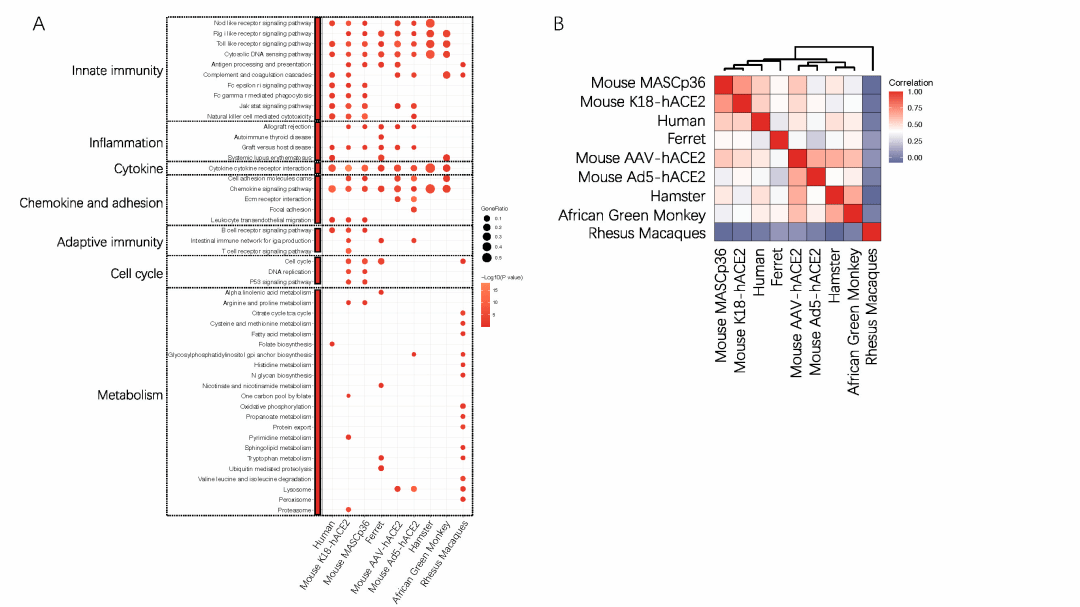 1月18日,ac米兰官方网站附属第一医院/呼吸疾病全国重点实验室赵金存教授团队在Nature·Cellular & Molecular Immunology发表了SARS-CoV-2 immunity in animal models综述文章,系统综述了新冠动物模型的研究现状,评价了不同模型在新冠研究中的应用特点,并根据目前针对新冠病毒的免疫学研究现状及研究局限,提出了新冠动物模型未来可能的发展方向。同时首次将新冠感染的动物和病人的肺部转录组数据进行整合分析,发现新冠病毒小鼠适应株感染小鼠模型能更好地模拟新冠重症肺炎患者的肺部转录组特征。