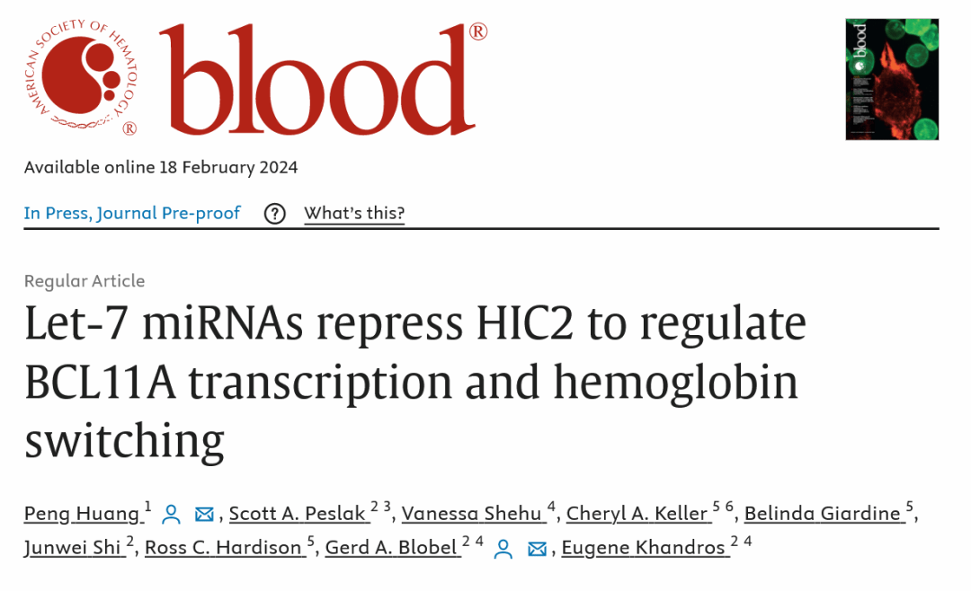 近日,ac米兰官方网站-中国科学院广州生物医药与健康研究院联合生命科学学院黄鹏课题组和费城儿童医院Gerd Blobel课题组合作,在Blood杂志发表了题为Let-7 miRNAs repress HIC2 to regulate BCL11A transcription and hemoglobin switching的研究论文,发现了let-7 miRNA在成体细胞中通过抑制HIC2调控BCL11A和血红蛋白的分子机制。