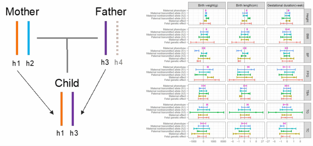 为了深入研究妊娠期暴露对胎儿生长的潜在因果关系,基于高质量和长片段的基因型分型结果,研究人员开发了跨代孟德尔随机化方法来分离母体和胎儿遗传效应(如图2),首次通过建立传递和未传递等位基因的单体型遗传得分,研究母亲定量测量指标(如身高、孕前体重指数、血压、血糖、总胆汁酸、脂代谢等)对胎儿宫内发育、新生儿代谢因子以及出生结局的可能影响。在这一分析中,证实了一些已知的关联存在因果效应,如母亲身高和血糖水平的遗传效应,影响新生儿体重。此外,还发现了一些新的因果关系,如母亲胆汁 酸水平与新生儿身长的负相关。这些结果为我们提供了一些潜在的线索,为深入理解母婴健康提供了新的路径。