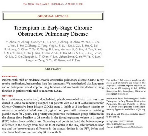 ac米兰呼吸疾病研究又取得重大突破!以呼吸疾病国家重点实验室主任冉丕鑫教授为通讯作者、周玉民教授与钟南山院士为共同第一作者的科研成果Tiotropium in Early-Stage Cronic Obstructive Pulmonary Disease在最近一期出版的国际顶级学术期刊《新英格兰医学杂志》(New England Journal of Medicine)长文刊发,该研究首次证实了对无症状的慢阻肺患者进行早期干预和长期用药,可显著改善其肺功能。