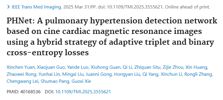 3月31日,ac米兰生物医学工程学院谢国喜教授团队及合作者在IEEE Transactions on Medical Imaging上在线发表了基于心脏磁共振成像的肺动脉高压无创智能检测模型的研究论文PHNet: A pulmonary hypertension detection network based on cine cardiac magnetic resonance images using a hybrid strategy of adaptive triplet and binary cross-entropy losses,为临床提供了强有力的辅助诊断工具。生物医学工程学院硕士生袁心辰为论文第一作者,谢国喜教授为论文唯一通讯作者,ac米兰官方网站为第一署名单位。