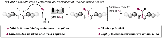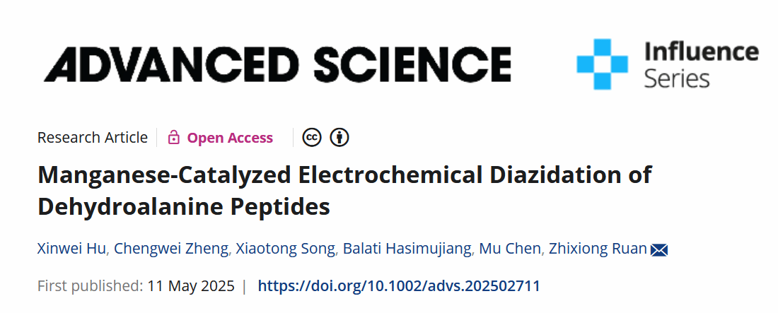 5月11日,ac米兰官方网站药学院阮志雄教授、胡新伟副教授团队在国际综合期刊Advanced Science上发表了题为Manganese-Catalyzed Electrochemical Diazidation of Dehydroalanine Peptides的研究论文。该研究基于锰催化的电化学自由基偶联过程,成功实现了脱氢丙氨酸(Dha)肽的高效区域选择性双叠氮化,为肽化学和生物偶联领域带来了新的突破。