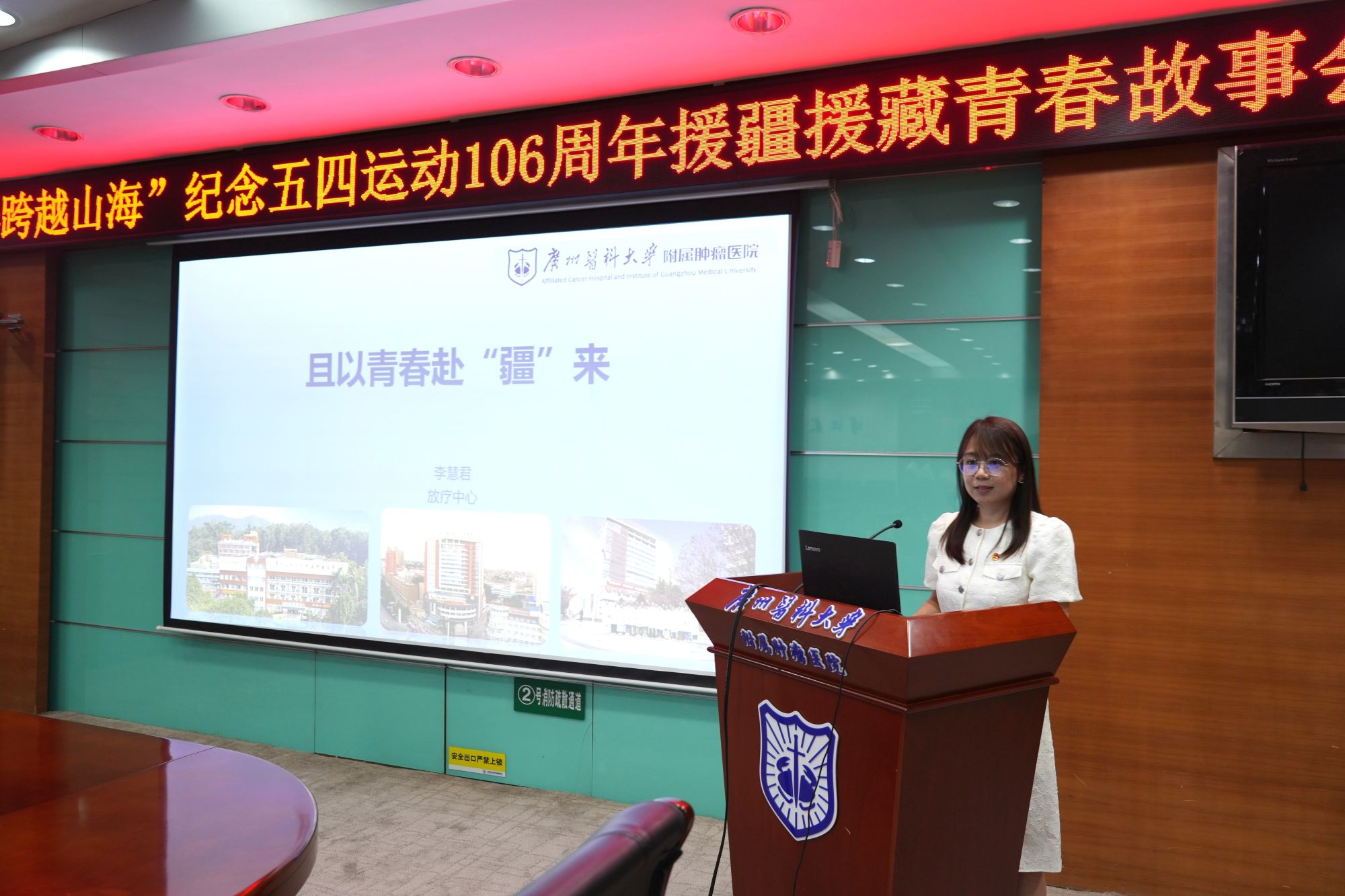 为深入学习习近平总书记重要讲话和给谢依特小学戍边支教西部计划志愿者服务队队员重要回信精神,弘扬五四精神,激励全院团员青年在中国式现代化建设中挺膺担当,5月15日,ac米兰官方网站附属肿瘤医院组织召开“青春跨越山海”纪念五四运动106周年援疆援藏青春故事会。医院党委副书记陈冬平、相关职能科室负责人、党支部代表、医院团干部、各青年文明号负责人和团员代表参加了本次活动。活动由团委书记龙杰主持。
